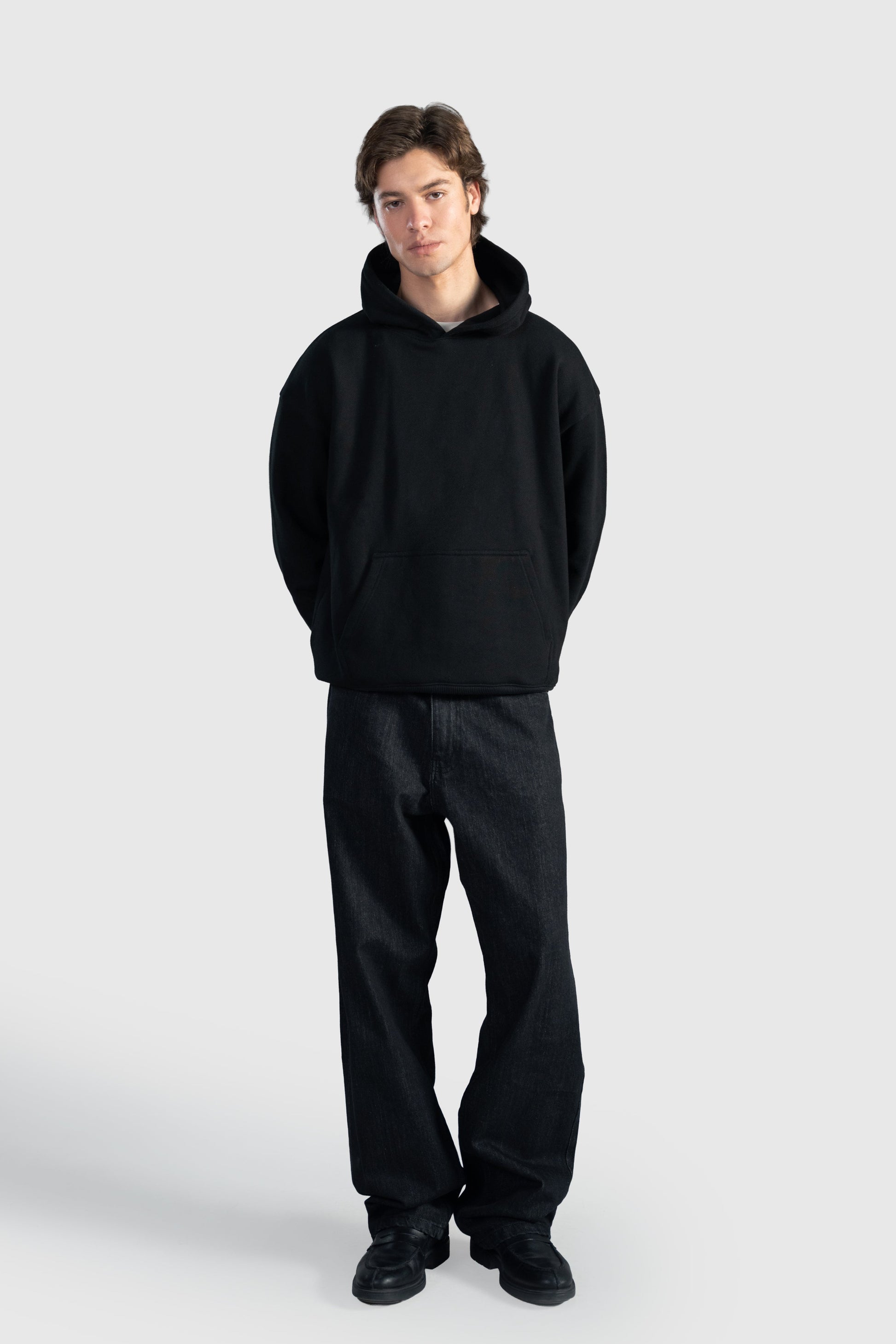 Designed in a slightly cropped, wide silhouette, this hoodie is crafted from heavyweight 500 GSM French terry for a structured yet comfortable feel. Made from 100% cotton, it features an external central pocket and ribbed cuffs and hem, creating a clean, modern everyday essential.