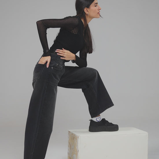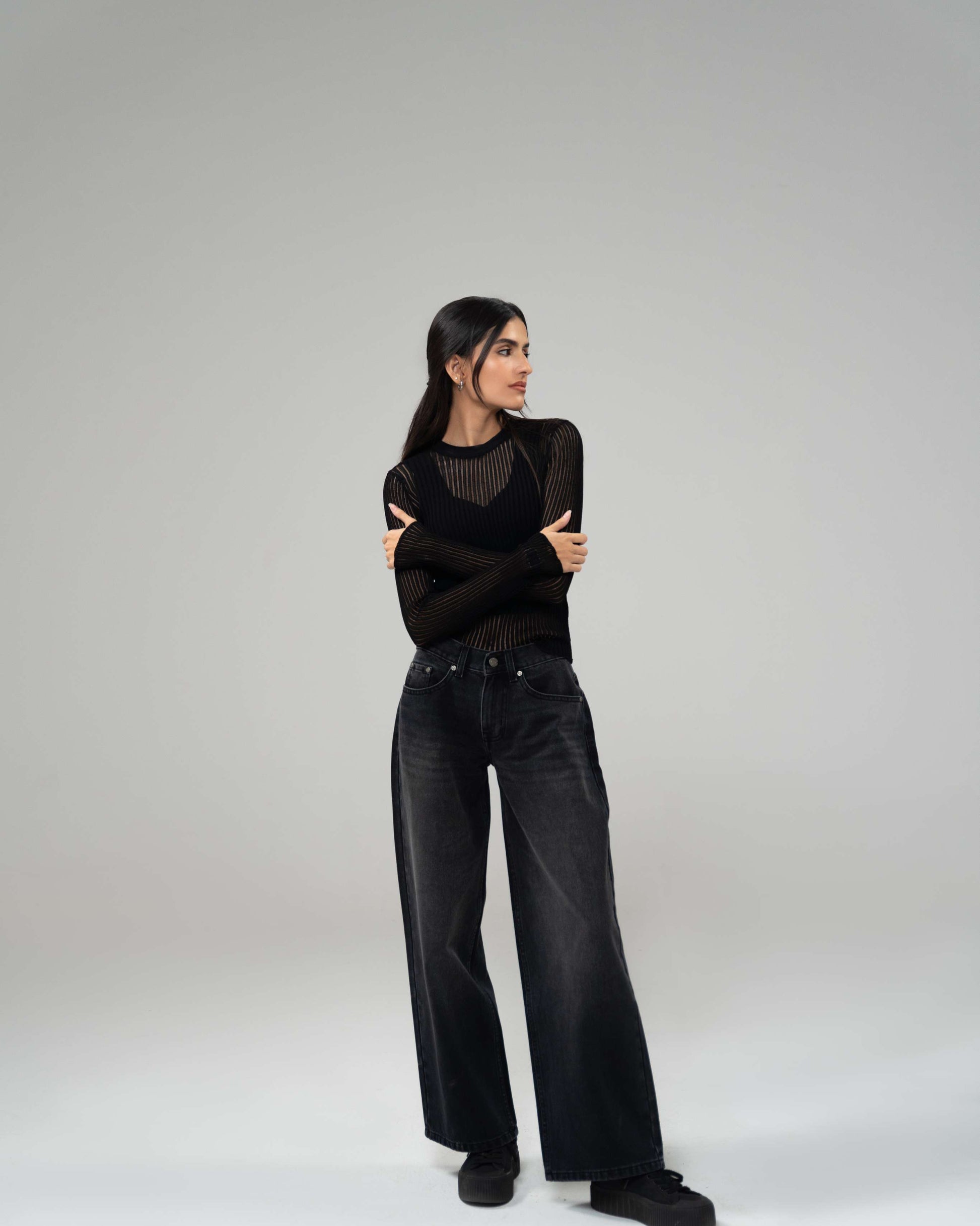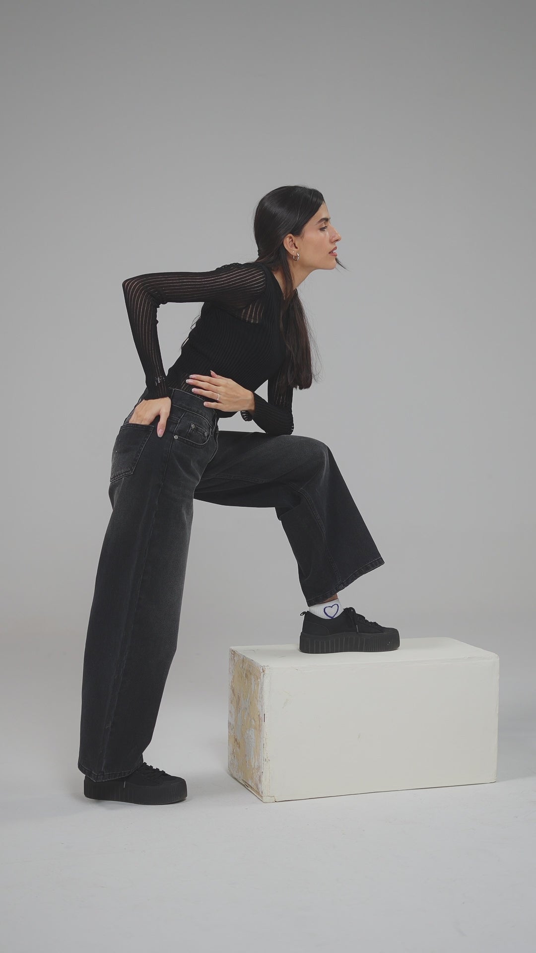 These charcoal black low-rise jeans feature a classic wide-leg silhouette, a durable 100% genuine leather patch, and a timeless five-pocket design. Crafted from rigid denim, they offer an effortlessly stylish and structured fit.