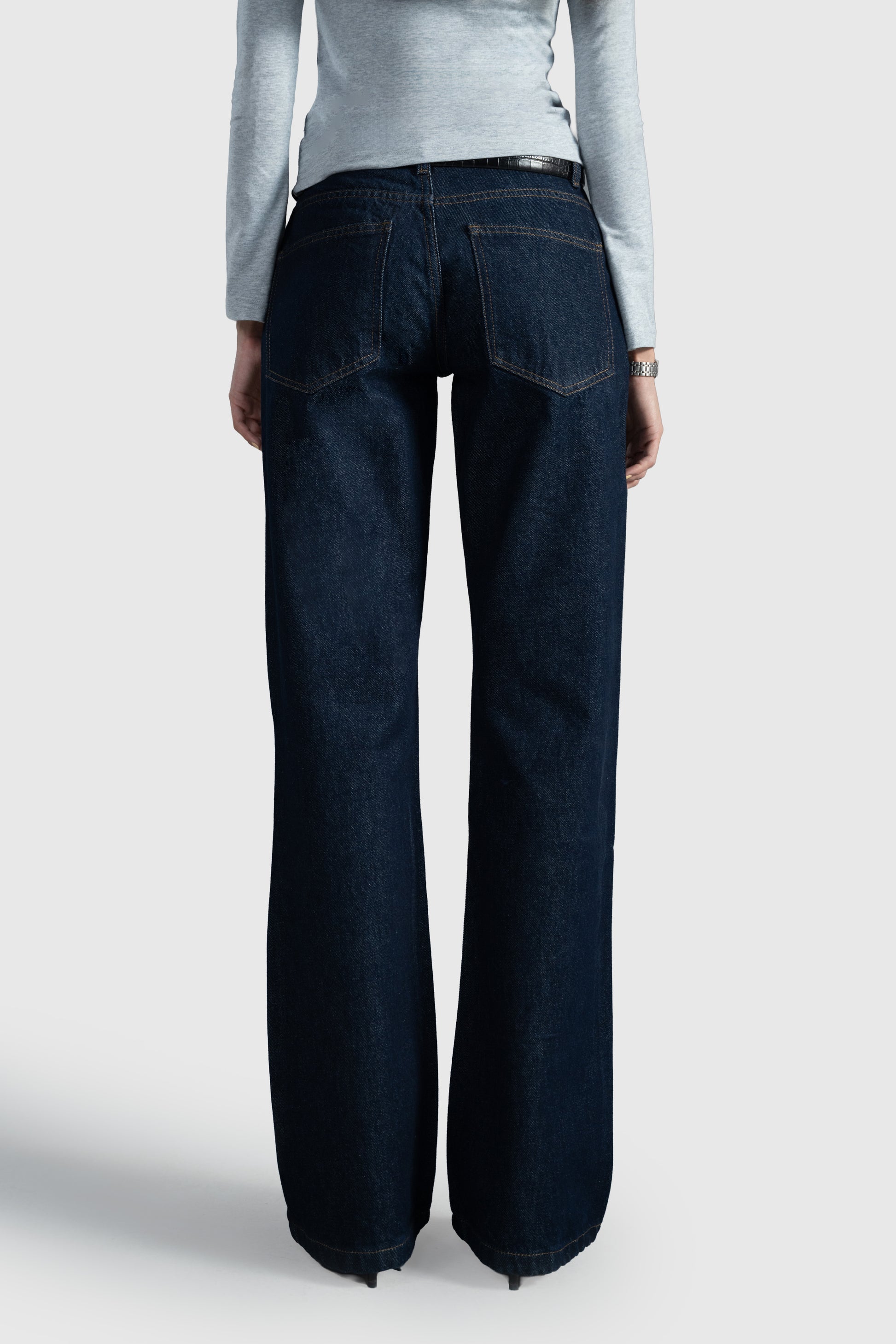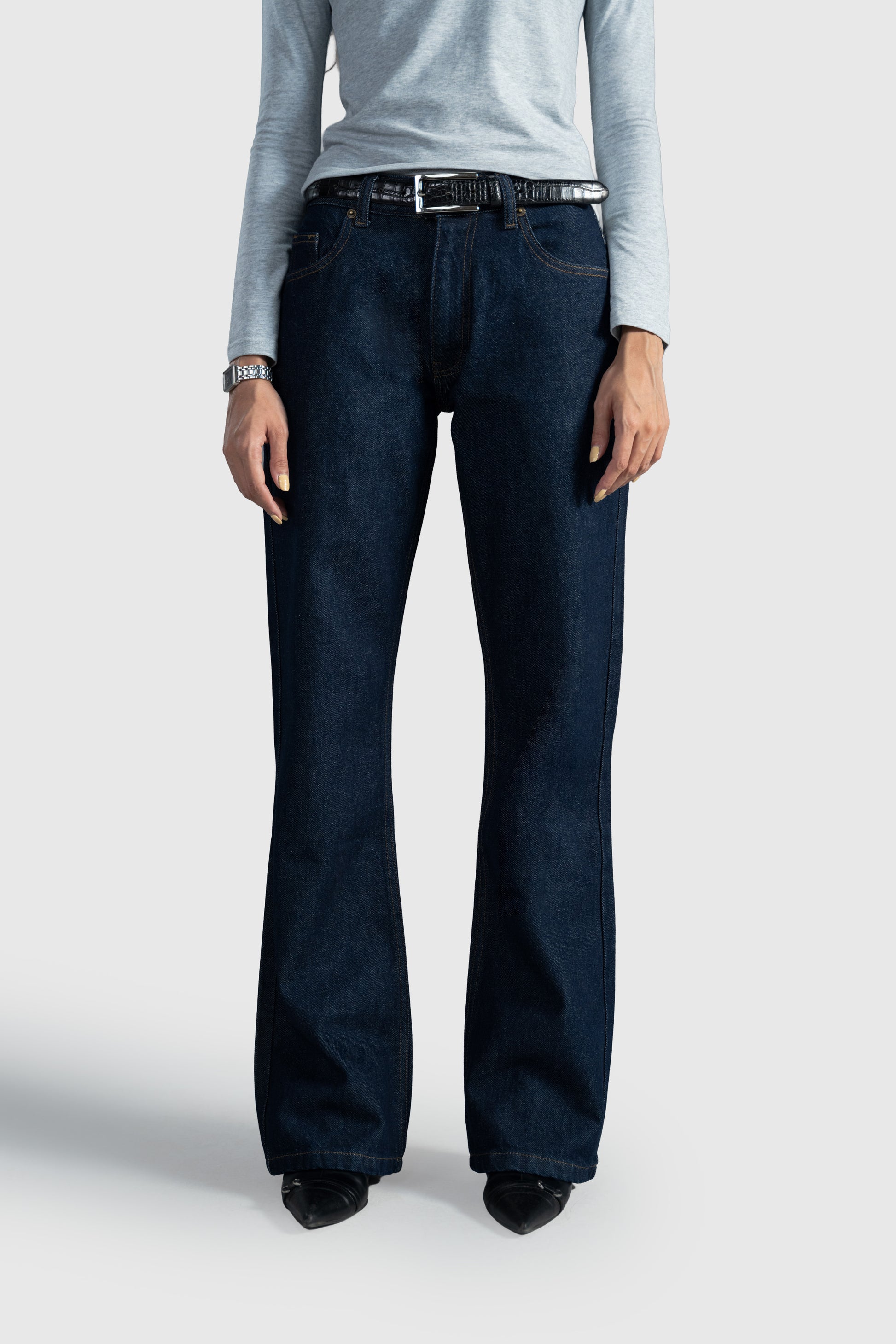 These raw blue low-rise jeans feature a medium flare silhouette, a durable 100% genuine leather patch, and a timeless five-pocket design. Crafted from rigid denim, they offer an effortlessly stylish and structured fit.
