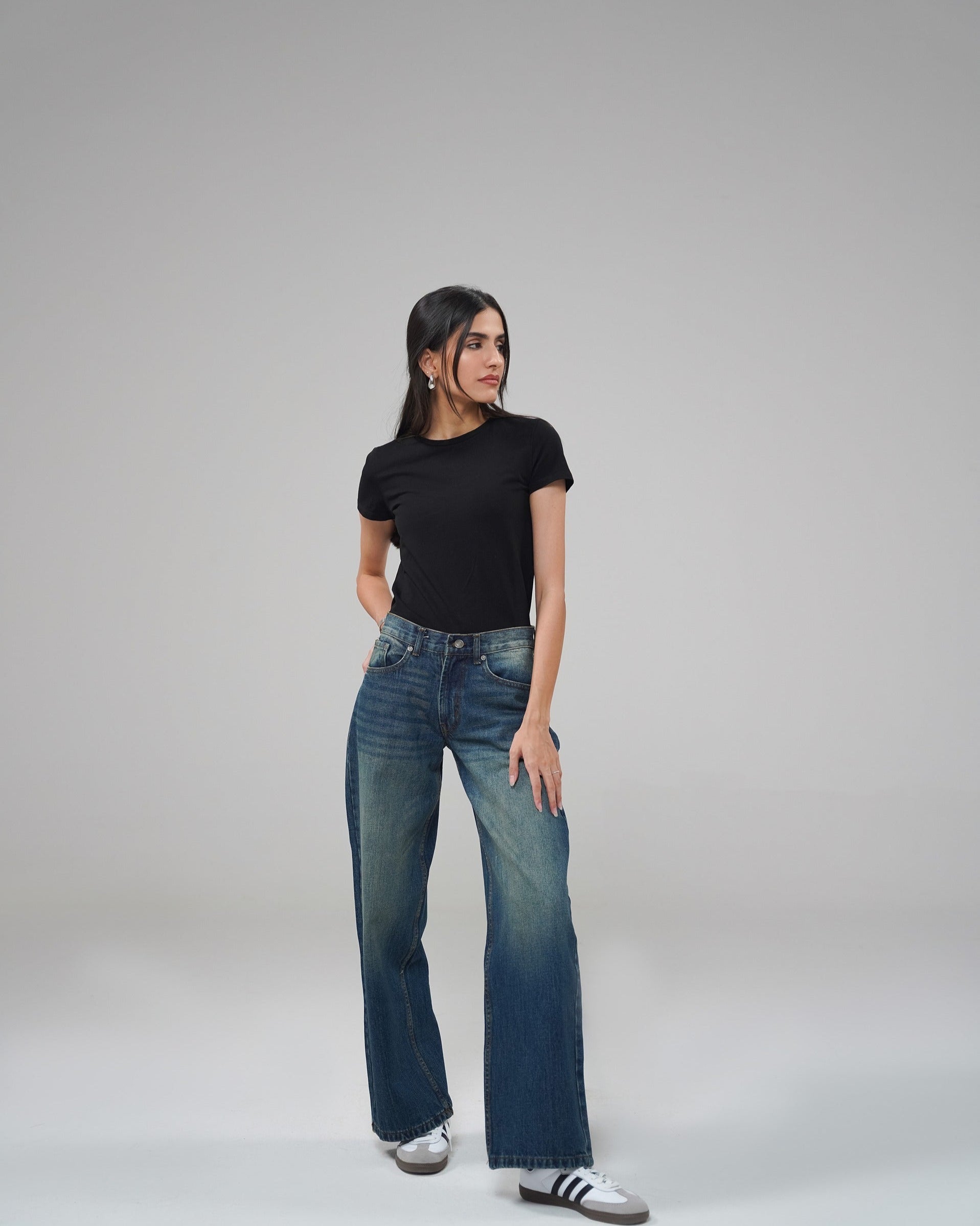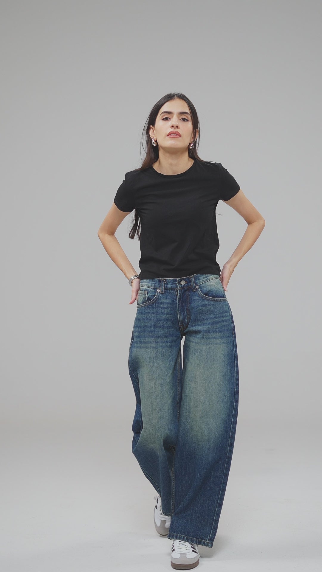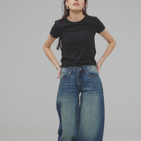 These dark blue low-rise jeans feature a classic wide-leg silhouette, a durable 100% genuine leather patch, and a timeless five-pocket design. Crafted from rigid denim, they offer an effortlessly stylish and structured fit.