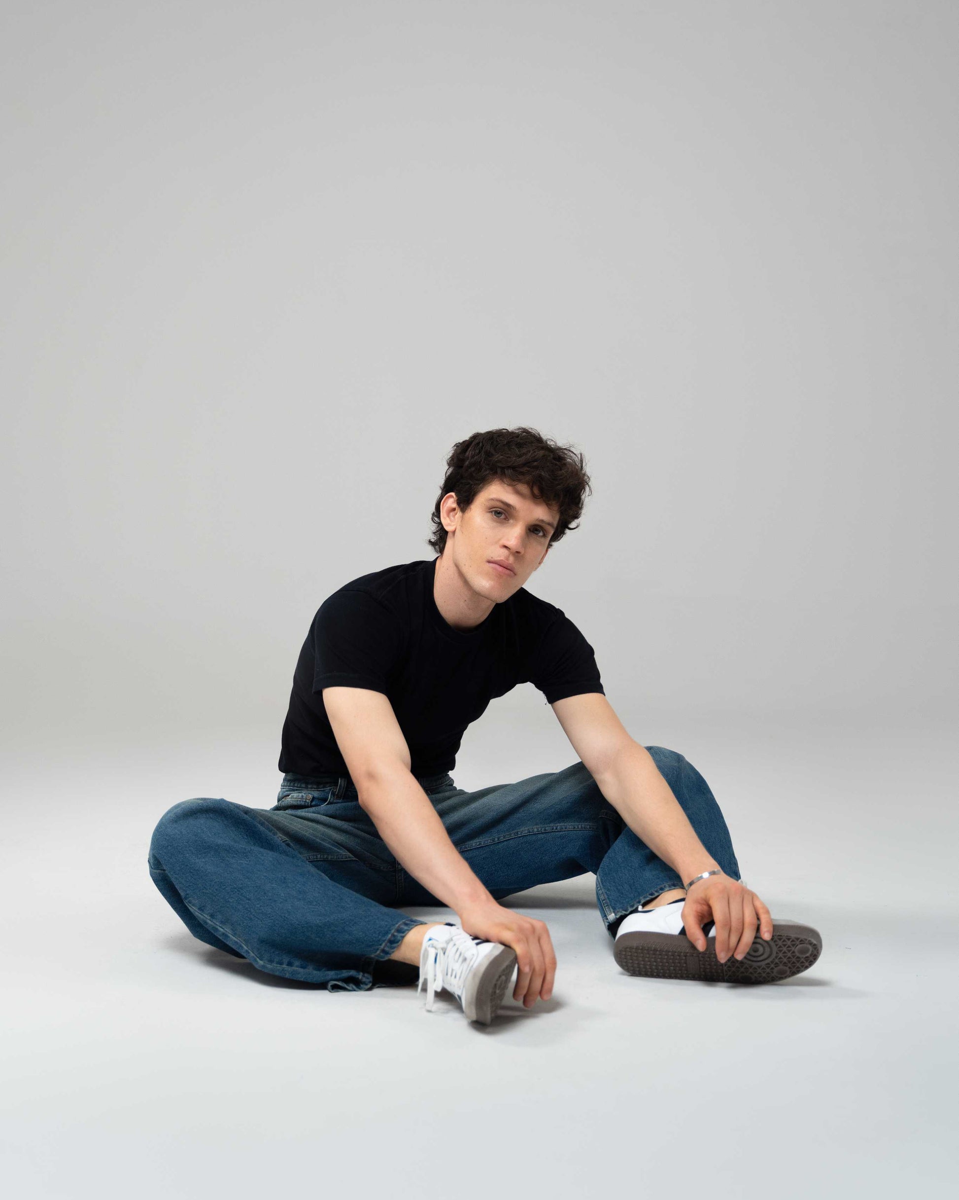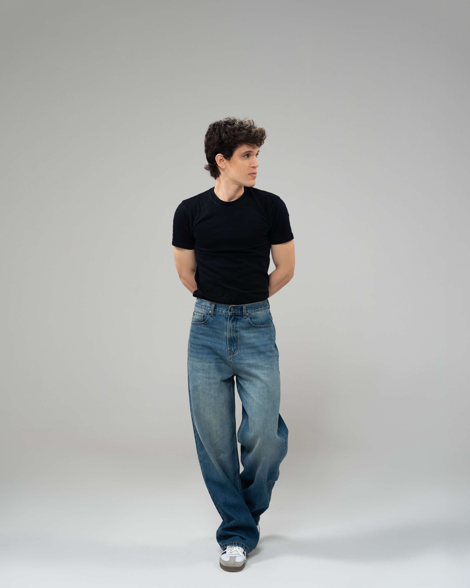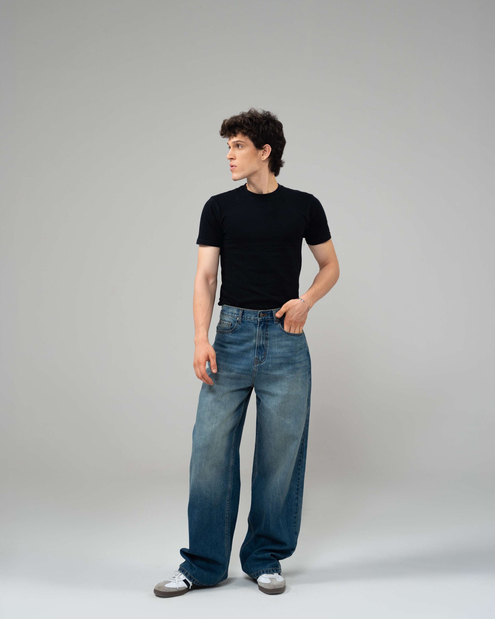These medium blue high-rise jeans feature a classic wide-leg silhouette, a durable 100% genuine leather patch, and a timeless five-pocket design. Crafted from rigid denim, they offer an effortlessly stylish and structured fit.